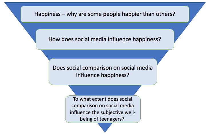You can’t ask a question you know nothing about. This is why EE supervisors, I think, need to refrain from giving the questions to their students. In the below example, you can see that understandably the first question is broad. The student doesn’t know about the psychology of happiness yet because they haven’t researched it. But over weeks and months of research, they learn about things like social comparison theory and subjective well-being (the psychologist’s term for happiness).