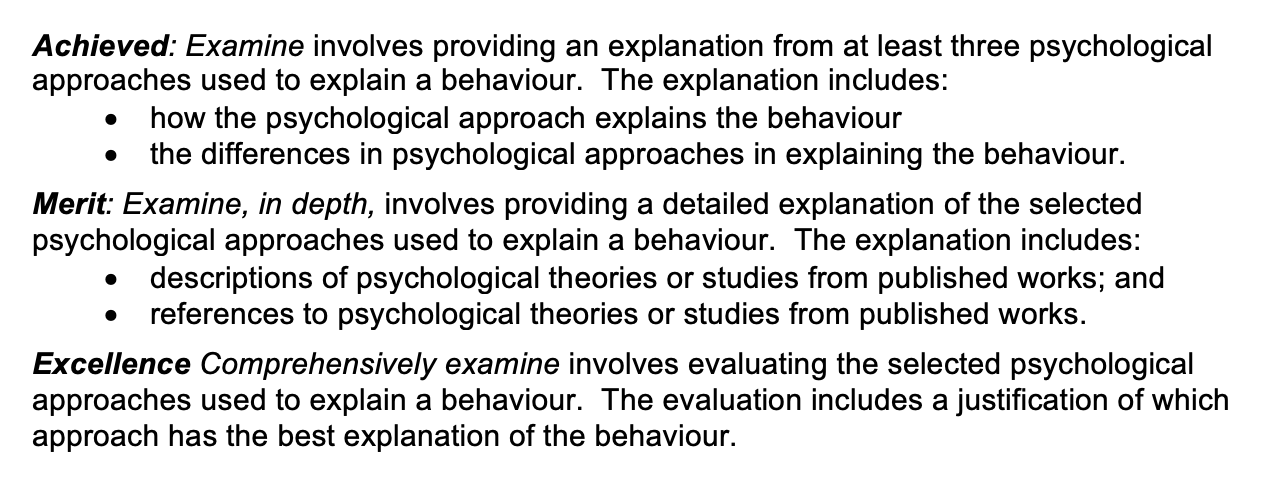 Command terms, command terms, how do I loathe thee? Let me count the ways. What a win for the good guys that the phrase “command term” has been erased from all marking rubrics in this new guide. I spent years teaching students the nuances between outline and describe and explain. Then after writing scores of my own answers I realized – they didn’t matter. We’re teaching psychology, not verbology. What’s far more important than the command term is the rest of the bloody question. Command terms hijacked our attention which seemed a uniquely Psychology phenomenon not witnessed in other subjects.