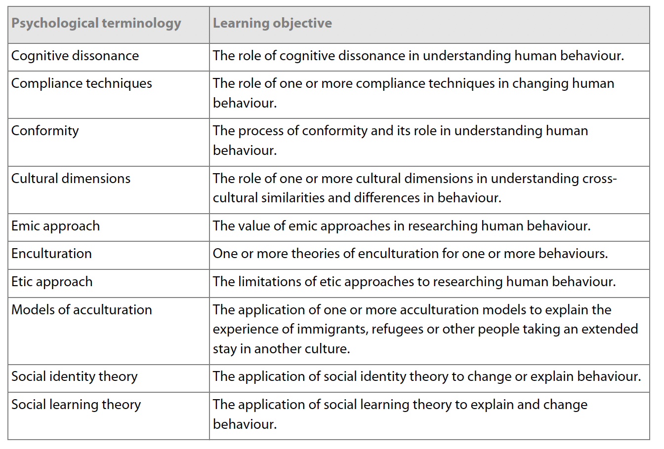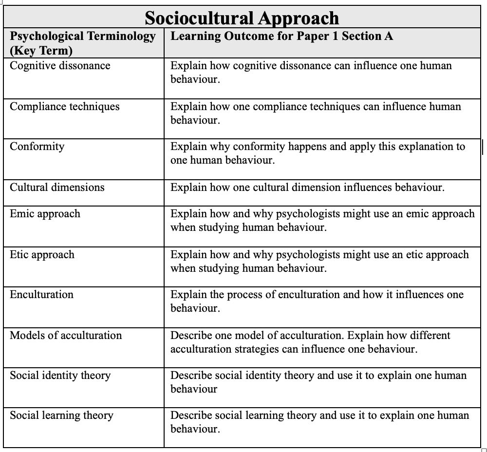 Let’s take the approach objectives to begin with. You’ll see below the learning objectives for the sociocultural approach. At first glance, the learning objectives tell us what we need to teach for each key psychological term. However, upon closer inspection I have a few questions: