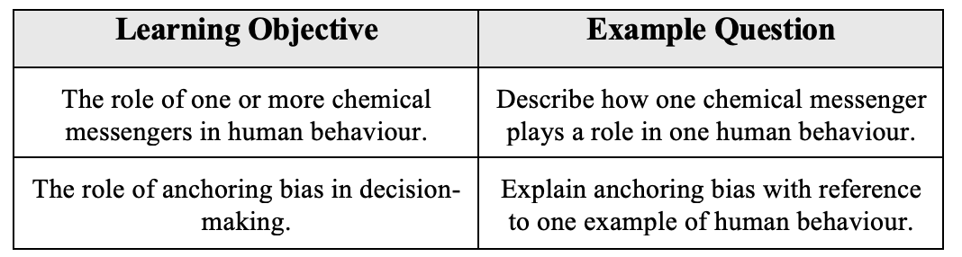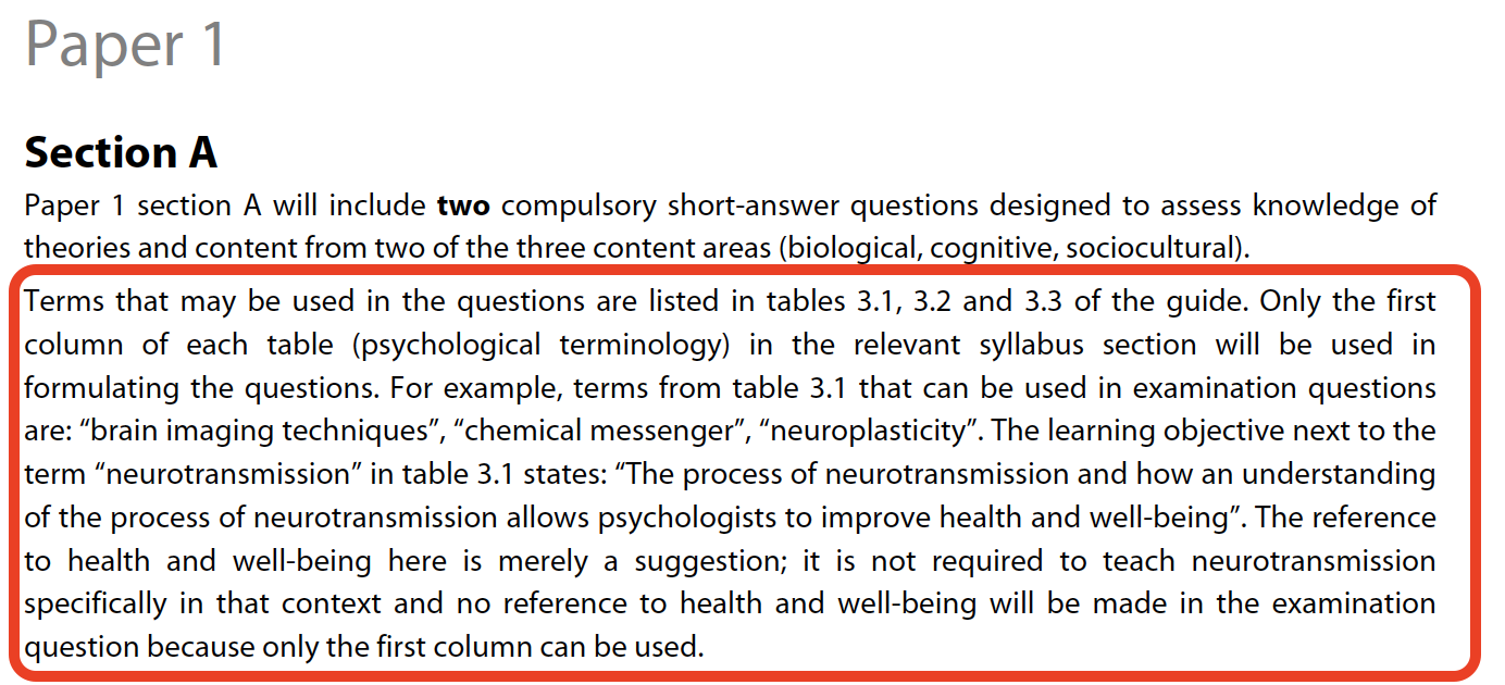 Scroll through the guide and you’ll see other confusing objectives, like “the strengths and limitations of a reductionist approach to the study of behaviour” or “the limitations of the argument that behaviour is localized.” You’ll see references to specific contexts like health and well-being. This raises the next big question…