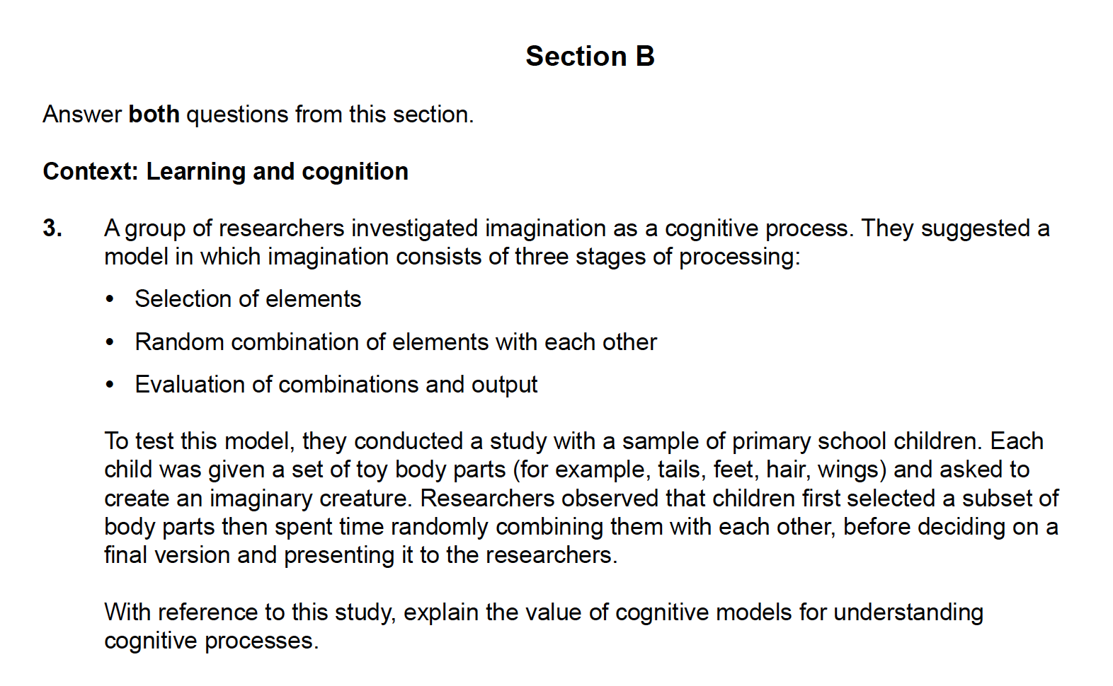 The plot thickens. In Section B, students are given an unseen context-specific situation or scenario and asked to apply their knowledge to it. The TSM provides the following example: [A description of a research study is provided.] With reference to this study, explain the role of models in the study of cognitive processes.
