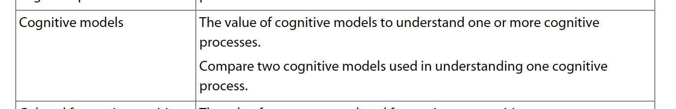But I have an issue with this example question. To demonstrate, consider the sample question from the specimen paper below. The question asks them to “explain the value of cognitive models for understanding cognitive processes.” To do this, they need to have a conceptual understanding of the general benefit of cognitive models. This, in my opinion, is an incredibly tricky task. I have a hunch that this specimen paper confused the learning objective from the Learning and Cognition context with the cognitive approach topic. You’ll see below the similarity between this learning objective and the specimen paper question. This is why in this particular example, when the SAQ topics are also potential essay topics, the SAQ learning objectives are less important because students will have more developed knowledge of these topics anyway because they’ll need them for the essay.