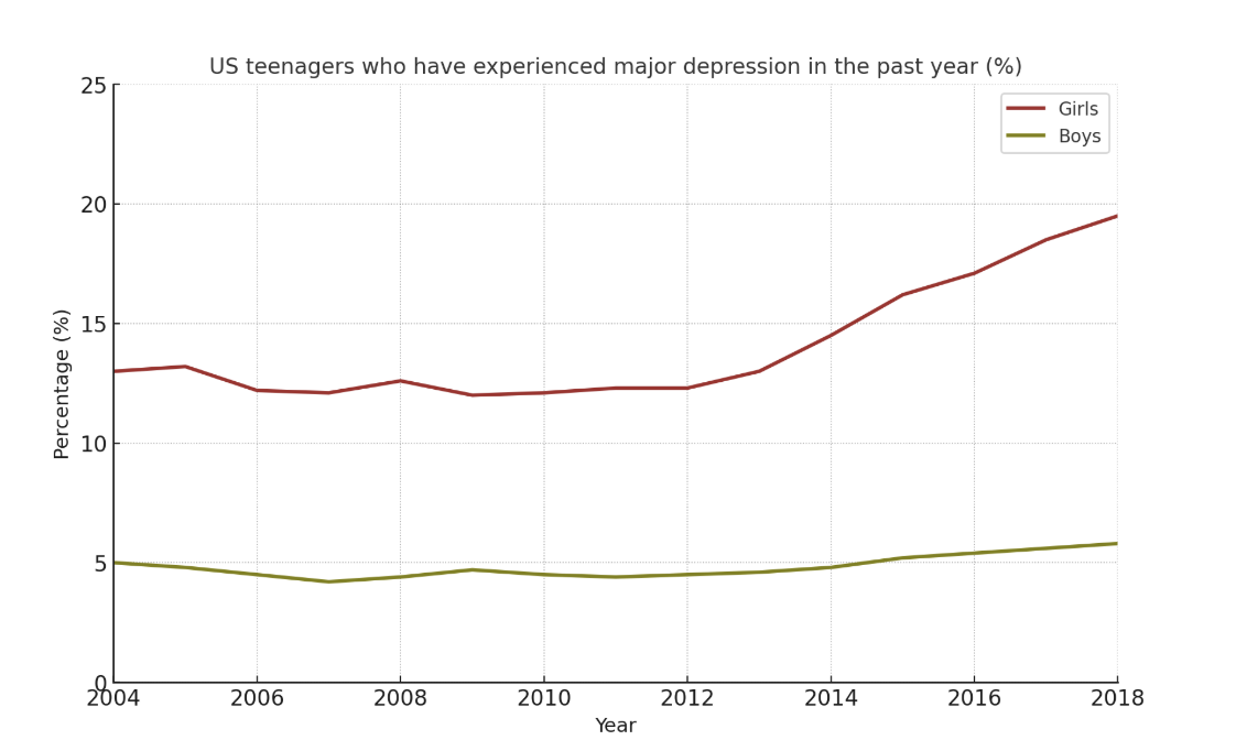 Example line graph on the effects of technology on depression. “Figure 1 | Depression on the rise. Rates of depression among teenagers in the United States have increased steadily since 2012. Rates are higher and are increasing more rapidly for girls than for boys. Some researchers think that social media is the cause of this increase, whereas others see social media as a way of tackling it.” Source: Haidt and Allen, Nature (Link). Graph recreated from original source by ChatGPT.