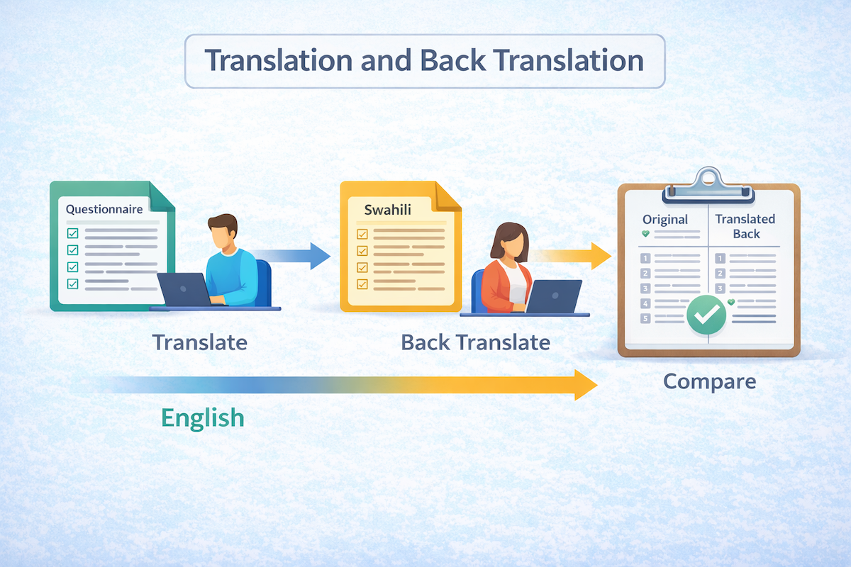 It’s important the questionnaire is standardised and consistent across cultures. If not, the validity of the data is weakened. However, this becomes a problem when the same questionnaire is being used in different languages. This is where translation and back translation are useful. The first step is for the questionnaire to be translated. For example, the PSS might be translated from English to Swahili. The questionnaire is then given to a second translator who back-translates it – they take it from Swahili and translate back to English. The researchers compare the back-translated questionnaire to their original to see if they’re the same. If they are, they can trust the translation. If not, they can repeat the process until they get consistency.