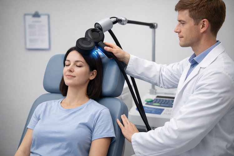 Transcranial magnetic stimulation (TMS) is a treatment that uses a machine to deliver magnetic pulses to specific parts of the brain. These pulses stimulate neurons and can enhance overall brain functioning. The frequency of the pulses can be adjusted, with higher frequencies generally increasing activity in targeted regions and lower frequencies decreasing it. Although TMS does not directly target specific neurotransmitters like serotonin or dopamine, it can precisely stimulate key areas for health and well-being, like the prefrontal cortex and the nucleus accumbens.