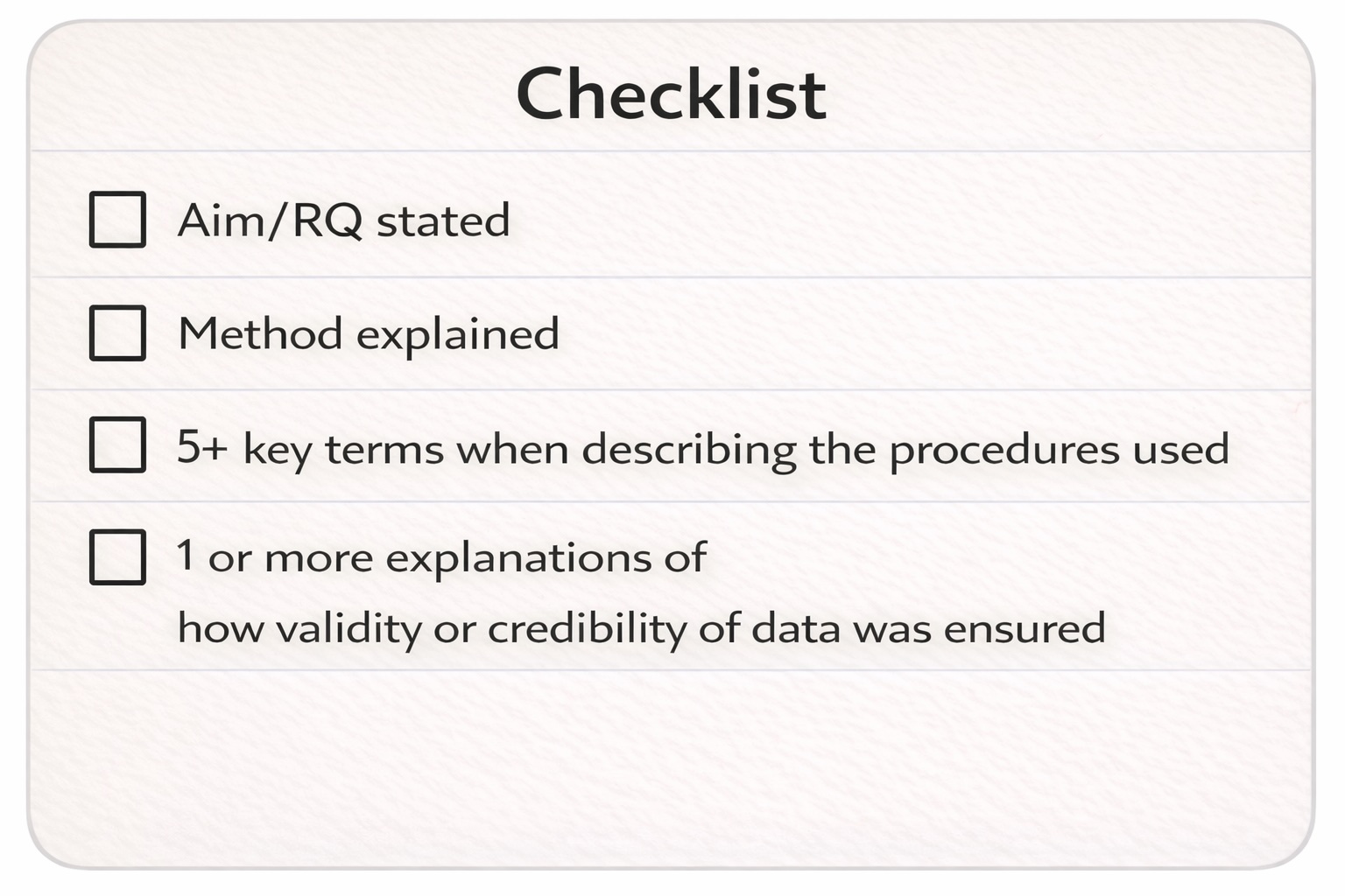 Tip: You can make your answer shorter (and faster to write) by including only the research question OR the aim, not both. I recommend making four flashcards of these – one for each method. It’s important to make a good first impression and get them right.