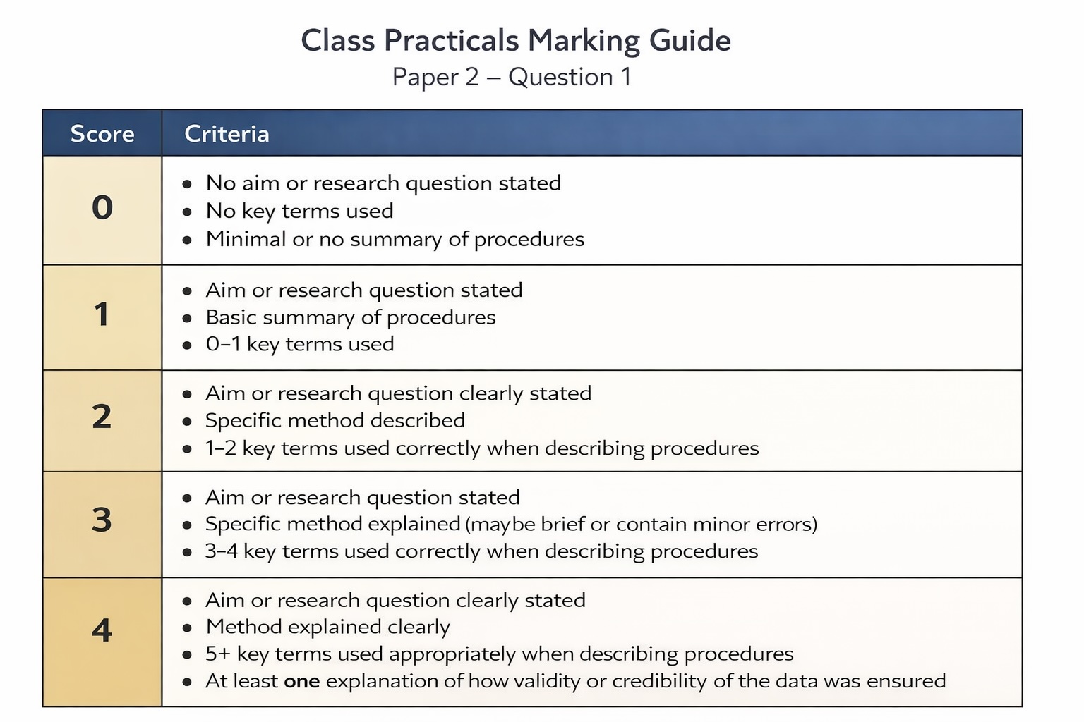 After writing the above samples and analysing the IB’s, I’ve devised the following marking guide. If you want to be really quantitative in your approach to marking, you could use something like the following checklist as a guide.